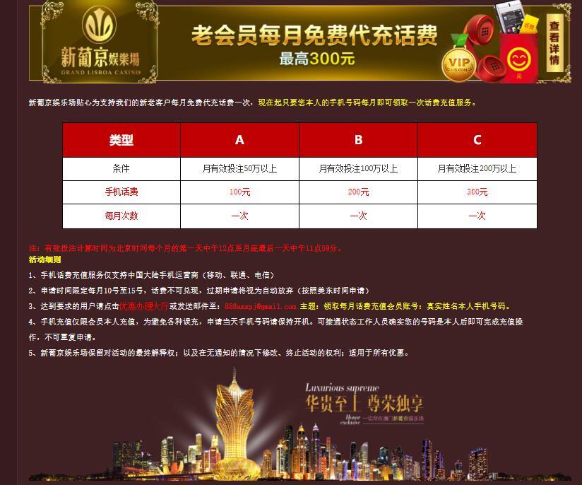 新葡京娱乐场,老会员每月免费代充话费,最高300元。